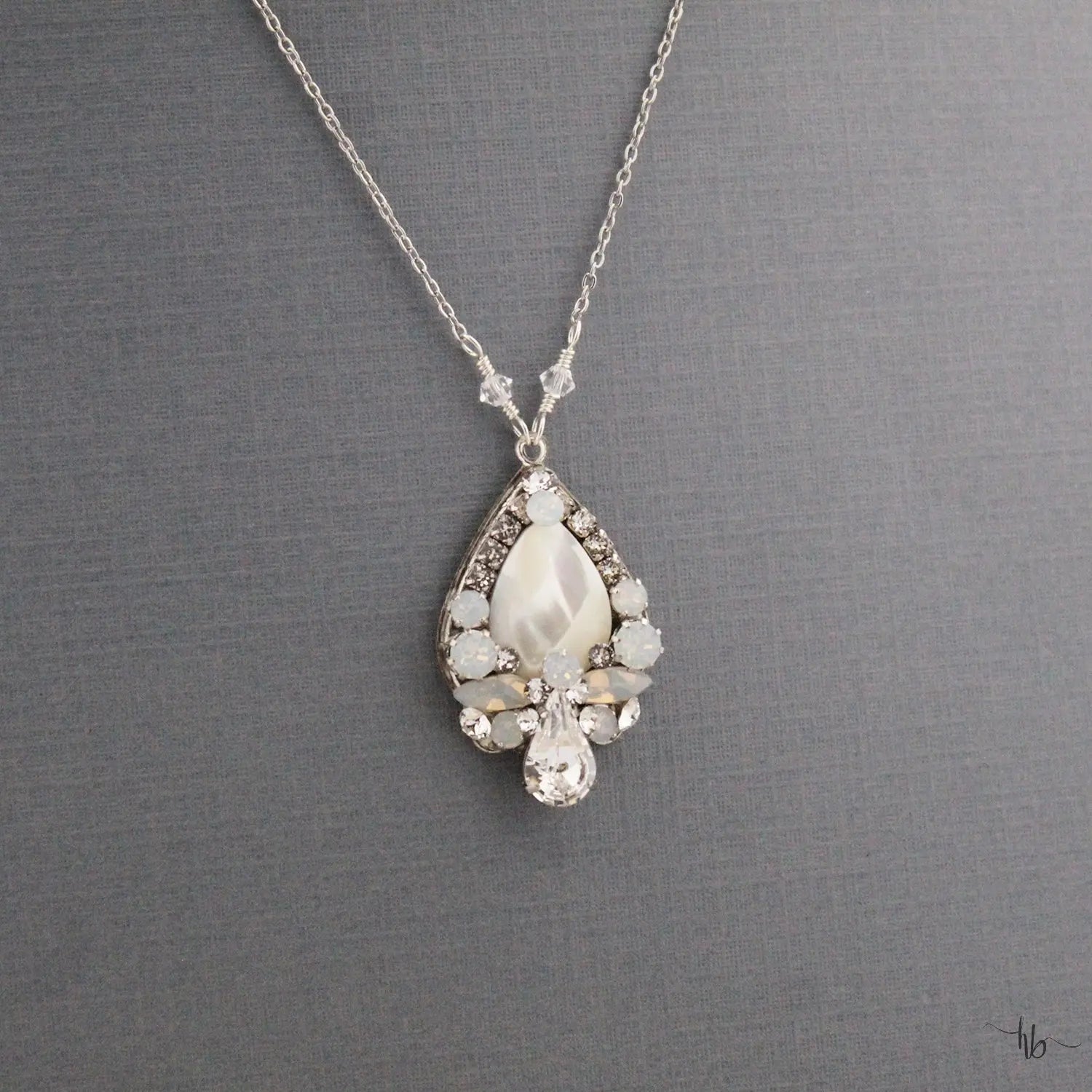 Teardrop faceted Mother of Pearl drop Bridal Necklace with Austrian crystalrhinestone accents.