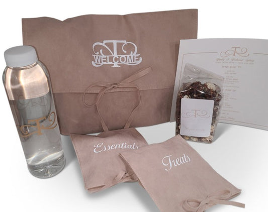 Welcome your guests in style with the Taupe Suede Welcome Bag. Perfect for your special occasion, it comes filled with chocolates, nuts, gourmet popcorn, candles, matches and water to provide a warm welcome. Embellished with an attractive welcome design, it is sure to make a statement. Also includes a matching itinerary to keep your guests informed.