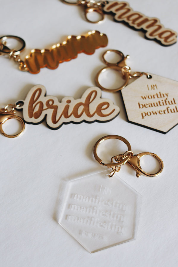 This manifesting keychain is designed to help manifest your dreams and desires in style. Customize with names, phrases, important dates, and announcements! Email us at hello@jisabeldesigns.com with questions or to place a custom order.