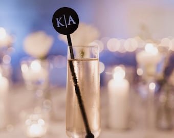 Classic wedding decor meets modern and minimalist wedding trends with these initial drink stirrers. Bulk package: 50 Per Pack Don't need this many? Not a problem! Please visit our smaller listing linked below :) https://www.etsy.com/listing/568484199/modern-initial-swizzle-stickswedding Shown in Black acrylic These gorgeous laser-cut acrylic initial drink stirrers can be customized with first or last name initials (2 letters total), bride and grooms initials, and so much more. These personalized initial stirrers are absolutely stunning and create a memorable statement in your home or at any special event. With a modern and edgy feel, we took a twist on the classic initial or monogram decor. Our custom and personalized laser cut acrylic stir sticks can be placed along with your table settings for each guest, used as table décor, photo props, and so much more for a wedding or any special occasion. Not to mention, they are the best way to dress up any drink! ;) Custom Initial Drink Stirrers: Letters and middle line are cutout of acrylic Ordering Instructions: Please select color of choice. Add to cart. In the "notes section" include up to 2 initials. Finally, simply choose your payment preference and checkout! :) All stirrers come with font shown in photos. If you are interested in a different font or design, please contact us for more info. :) Have a logo or preferred design? Custom sizes and designs available, please inquire if interested. Most of our drink stirrers run just a little over 6 inches in height depending on design (all of our drink stirrers are between 5inches-5 1/2 inches in height plus roughly 1inch for top design). If you need them a specific height, our drink stirrers can be made taller or shorter for custom orders easily. :) Don't worry about paint or wood chipping; these long lasting gorgeous acrylic swizzle sticks are made from the best quality and 100% made in USA. We design and make all of our items with our own machines and hands, no outsourcing here! First 4 photos by: Dark Room Photo Please note that all mirrored acrylics have gray backings. Made in San Diego, CA Please note, one thing these babes are not ...TOYS! Please keep away from those adorable children of yours! Other than that, have fun. Made with Shatterproof Acrylic Wedding Drink stirrers, Cocktail stirrers, custom Stirrers, Drink Stirrers, initial Drink Stirrers, Cocktail Stick, Party Sticks, 50pack ****COLORS**** More to come! Please note: Colors may vary on your computer screen and/or electronic devices such as cell phones. Don't see a color you like, please message us and we might just have it! If not? We can try to get you exactly what you are looking for! Custom Orders We love custom orders!!! Send us a message and we can chat about creating the perfect party necessity for your next event! First four photo credit: Dark Room Photo