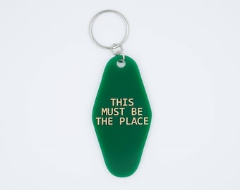 Personalized Gift and stocking stuffer! These are the funnest, cutest, catchiest and just darn best vintage style hotel key tags around! KeyChain Reads: "This Must Be The Place" Perfect stocking stuffer for your bff, sister, coworker, etc! We are just swooning over our newest addition to our personalized goodies! Say hello to our one of a kind laser cut, etched and hand ink filled vintage hotel key acrylic key chains that feature one of our numerous fun and clever designs. These adorable additions make perfect gift for just about anyone on your list! Choose from our vast variety of acrylic colors for your throwback and fabulously fun keychain and choose the ink fill color you'd like, then we can laser etch and hand ink fill your gift! These are not pre-ordered plastic keychains with the image printed or with a vinyl decal. These are handcrafted by just the two of us here in San Diego, Ca with our own machines and hands. Each keychain is designed by us, the acrylic is laser cut, then laser etched followed by hand ink fill. Each piece is custom and unique in its own way and we're truly proud of every order that goes out the door. Colors Shown: First Photo: Green acrylic with gold ink fill Second Photo: Shown in blue Acrylic with white ink fill with Silver key ring. Message us for bulk orders! :) How to order: 1) Select color from first drop down menu, (this will be the acrylic color) 2) Select ink fill color from the second drop down menu 3) Select quantity 4) Checkout and then simply select your payment method of choice and that's it! :) ***Please state in the "notes to seller section the color key ring you would like*** Silver and Gold Key Rings Available: If no request is made for key ring color, standard silver will be included Each key chain comes ready to gift! Placed on top a bed of cotton for protection, our key chains are packaged inside a white keepsake box. The clear lid beautifully displays the key chain inside and is held in place with a gold stretch bow. One key chain per order Please note that all mirrored acrylics have gray backings. Dimensions: Key Tag: 3 inches tall, 1.5 inches wide Want a custom key tag?!?!? With your own quote or design? Not a problem, please see our best selling listing below and guess what, NO MINIMUMS!!!! :D https://www.etsy.com/listing/491444848/personalized-vintage-hotel-key-chaingift Made in San Diego, CA 100% Made in the USA! Made with Shatterproof Acrylic ****COLORS**** More to come! Please note: Colors may vary on your computer screen and/or electronic devices such as cell phones. Don't see a color you like, please message us and we might just have it! If not? We can try to get you exactly what you are looking for! Custom Orders We love custom orders!!! Send us a message and we can chat about creating the perfect party necessity for your next event!