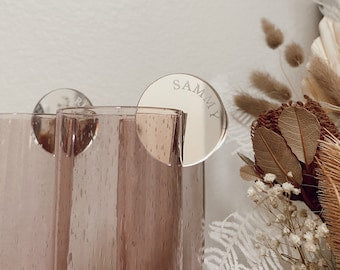 Champagne stemless Drink Tag, Acrylic Personalized Drink Stirrer, Place Setting, Engraved Place Card, Drink Stirrers, Acrylic Place Cards Personalized Stemless Escort Card (Or place setting) Stirrers are here! Shown in mirrored silver and mirrored gold Each Individual Stemless Escort Card Includes (up to): One first and last name (for example: An order of 10 will have ten different names (Cards), one for each guest) Don't need table number and meal preference? Not a problem, these are to be used as place settings as well with just individual names! (Ordering instructions below) JUST ADDED: MIRRORED ROSE GOLD & Mirrored Bronze These gorgeous laser-cut etched personalized acrylic stemless card drink stirrers are absolutely stunning and create a memorable statement for any special event! Not only will these be a show stopping statement piece, they are an innovative way to display your event's seating chart AND serve as brilliant favors. Your wedding or event will be unforgettable with special details that leave your guests in awe. Our custom and personalized laser cut etched acrylic stemless escort card stir sticks can be placed on the rim of almost any glass of welcoming champagne to greet guests, placed along with your table settings for each guest, used as table décor, table place cards, photo props and so much more for a wedding or any special occasion. Not to mention, they are the best way to dress up any drink! ;) Custom Etched Acrylic Stemless Escort Card Drink Stirrers Each Individual Stemless Escort Card Includes (up to): One first and last name, table number, and meal preference (please see third and fourth photos in the listing for reference) (for example:An order of 10 will have ten different names (Cards), one for each guest) Don't need table number and meal preference? Not a problem, these are to be used as place settings as well with just individual names! | How To Order | 1. Select the color 2. Select Quantity (no min. no max) 4. State the date needed in hand in the "Personalization Box" -When ordering, please leave guest list in notes to seller section at checkout OR After the order is placed, you can message us via etsy with your list or email (JennandJulesDesigns [!at] gmail.com) your guest list to us. ... whichever method is most convenient for you **Want a different shape of stirrer, font? Not a problem! Just send us a message and we can go from there! Our personalized etched acrylic stemless escort card drink stirrers will fit on the rim of a wide variety of champagne flutes and glassware of all shapes and sizes including shot glasses. Don't worry about paint or wood chipping; these long lasting gorgeous acrylic stemless escort card swizzle sticks are made from the best quality and 100% made in USA. We design and make all of our items with our own machines and hands, no outsourcing here! Please note that all mirrored acrylics have grey backings. Made in San Diego, CA 100% Made in the USA! Again, 100% Made in the USA! ***Size*** 1.75" Diameter (Can be customized to be larger, message before ordering if you'd like a custom size) Please note, one thing these babes are not ...TOYS! Please keep away from those adorable children of yours! Other than that, have fun. Made with Shatterproof Acrylic ****COLORS**** More to come! Please note: Colors may vary on your computer screen and/or electronic devices such as cell phones. Don't see a color you like, please message us and we might just have it! If not? We can try to get you exactly what you are looking for! Custom Orders We love custom orders!!! Send us a message and we can chat about creating the perfect party necessity for your next event! First and second photo credit: Wild Native Photography (planner: bumble burgh Events Co.) Third and fifth photo credit: Emily Jane Photography