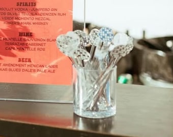 Disco ball stirrers Now available in our glitter acrylic colors including iridescent glitter!!!! Priced for a pack of 25 stirrers. Disco swizzle sticks Shown in clear acrylic (first photo) and mirrored silver These gorgeous laser-cut etched disco ball acrylic drink stirrers are absolutely stunning and create a memorable statement in your home or at any special event. Most of our drink stirrers run just a little over 6 inches in height depending on design (all of our drink stirrers are between 5inches-5 1/2 inches in height plus roughly 1inch for top design). If you need them a specific height, our drink stirrers can be made taller or shorter for custom orders easily. :) Don't worry about paint or wood chipping; these long lasting gorgeous acrylic swizzle sticks are made from the best quality and 100% made in USA. We design and make all of our items with our own machines and hands, no outsourcing here! Disco ball Drink Stirrers,Art Deco Wedding Decor,Glitter disco,iridescent decor,Swizzle Sticks,Micro wedding,Stir Sticks,Wedding Decor,25 Pk Please note that all mirrored acrylics have gray backings. Made in San Diego, CA 100% Made in the USA! Again, 100% Made in the USA! Please note, one thing these babes are not ...TOYS! Please keep away from those adorable children of yours! Other than that, have fun. Made with Shatterproof Acrylic ****COLORS**** More to come! Please note: Colors may vary on your computer screen and/or electronic devices such as cell phones. Don't see a color you like, please message us and we might just have it! If not? We can try to get you exactly what you are looking for! Custom Orders We love custom orders!!! Send us a message and we can chat about creating the perfect party necessity for your next event!