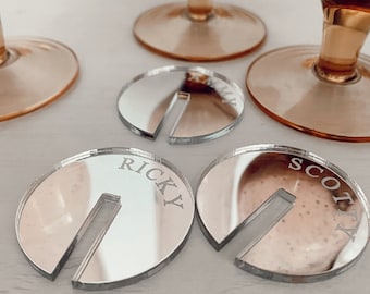 Custom Personalized Drink Charm,Wedding Glass Charms,Cocktail Names, Champagne Tags, Place Setting Wall , Seating Chart,Wine Charms,Stirrers Personalized Stemless Escort Card (Or place setting) Stirrers are here! Shown in mirrored silver and mirrored gold Each Individual Stemless Escort Card Includes (up to): One first and last name (for example: An order of 10 will have ten different names (Cards), one for each guest) Don't need table number and meal preference? Not a problem, these are to be used as place settings as well with just individual names! (Ordering instructions below) JUST ADDED: MIRRORED ROSE GOLD & Mirrored Bronze These gorgeous laser-cut etched personalized acrylic stemless card drink stirrers are absolutely stunning and create a memorable statement for any special event! Not only will these be a show stopping statement piece, they are an innovative way to display your event's seating chart AND serve as brilliant favors. Your wedding or event will be unforgettable with special details that leave your guests in awe. Our custom and personalized laser cut etched acrylic stemless escort card stir sticks can be placed on the rim of almost any glass of welcoming champagne to greet guests, placed along with your table settings for each guest, used as table décor, table place cards, photo props and so much more for a wedding or any special occasion. Not to mention, they are the best way to dress up any drink! ;) Custom Etched Acrylic Stemless Escort Card Drink Stirrers Escort cards,drink tags,champagne wall, Acrylic Personalized Drink Stirrer, Place Setting, Engraved Place Card,name tag,drink hang Each Individual Stemless Escort Card Includes (up to): One first and last name, table number, and meal preference (please see third and fourth photos in the listing for reference) (for example: An order of 10 will have ten different names (Cards), one for each guest) Don't need table number and meal preference? Not a problem, these are to be used as place settings as well with just individual names! | How To Order | 1. Select the color 2. Select Quantity (no min. no max) 4. State the date needed in hand in the "Personalization Box" -When ordering, please leave guest list in notes to seller section at checkout OR After the order is placed, you can message us via etsy with your list or email (JennandJulesDesigns [!at] gmail.com) your guest list to us. ... whichever method is most convenient for you **Want a different shape of stirrer, font? Not a problem! Just send us a message and we can go from there! Our personalized etched acrylic stemless escort card drink stirrers will fit on the rim of a wide variety of champagne flutes and glassware of all shapes and sizes including shot glasses. Don't worry about paint or wood chipping; these long lasting gorgeous acrylic stemless escort card swizzle sticks are made from the best quality and 100% made in USA. We design and make all of our items with our own machines and hands, no outsourcing here! Please note that all mirrored acrylics have grey backings. Made in San Diego, CA ***Size*** 1.75" Diameter (Can be customized to be larger, message before ordering if you'd like a custom size) Please note, one thing these babes are not ...TOYS! Please keep away from those adorable children of yours! Other than that, have fun. Made with Shatterproof Acrylic ****COLORS**** More to come! Please note: Colors may vary on your computer screen and/or electronic devices such as cell phones. Don't see a color you like, please message us and we might just have it! If not? We can try to get you exactly what you are looking for! Custom Orders We love custom orders!!! Send us a message and we can chat about creating the perfect party necessity for your next event! Custom Personalized Drink Charm,Wedding Glass Charms,Cocktail Names, Champagne Tags, Place Setting Wall , Seating Chart,Wine Charms,Stirrers