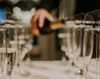 Escort Cards for Champagne Glasses - acrylic stirrer, place cards, champagne wall, Personalized, lux wedding, etched custom
