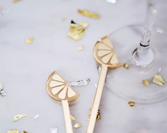 Shown in Mirrored Gold and wood This set is for 50 stirrers and sold at our bulk discount rate. Additional discounts may be applied for orders of 250 stirrers or more. If you have any questions, please be sure to send us a message and we'll help anyway we can. :) Available as cake toppers, and cupcake toppers, please message for more information. :) Our Lime Half Drink Stirrer Set is sure to get you ready for any tropical festivity. From jet setting this holiday season to some fabulous tropical destination, hanging pool side with your besties, throwing the most amazing event or wedding this year, our citrus lime drink sticks are sure to leave a lasting impression and dress up your cocktails like never before! These fresh and stylish lime stir sticks make the absolute best accessory for any party, event, celebration, wedding, birthday, bachelorette, etc. Or add that perfect touch to your home decor, bar cart and holiday touches. We just love how lux and versatile these are! And these fabulous palm stir sticks make the perfect gift for just about anyone. The attention is in the details and these adorable additions are sure to leave their mark! Any event that deserves a little love is sure to make a splash with these fun and posh fabulous drink stirrers. Who isn't just swooning over the citrus lime decor craze?! So fresh!!! We're definitely big fans over here!!! What could be better than that you ask? They're affordable, made right here in sunny San Diego by our very own hands and our very own machines, annnd we have a vast selection of QUALITY shatterproof acrylic colors, including Jenn's favorite (the Gold Glitter). And even better? These babes aren't just for show, the stick is made wide enough to stir your drinks (a stirrer that actually stirs? yes please ;)) So get ready to add that perfect, fun touch to your wedding, birthday, corporate party, or any other event that is destined to go down in the history books (at least in your eyes right!? ;) Most of our drink stirrers run just a little over 6 inches in height depending on design (all of our drink stirrers are between 5inches-5 1/2 inches in height plus roughly 1inch for top design). If you need them a specific height, our drink stirrers can be made taller or shorter for custom orders easily. :) So fresh! Lime swizzle stick,Drink Stirrer,citrus theme,summer cocktail,wedding bar,palm springs,pool party,Tropical drink tag,Cocktail Stick,50Pk Please note that all mirrored acrylics have gray backings. Handcrafted in San Diego, CA Please note, one thing these babes are not ...TOYS! Please keep away from those adorable children of yours! Other than that, have fun and get ready to add a little love to your party or event! Made with high quality Shatterproof Acrylic ****COLORS**** More to come! Please note: Colors may vary on your computer screen and/or electronic devices such as cell phones. Don't see a color you like, please message us and we might just have it! If not? We can try to get you exactly what you are looking for! Custom Orders We love custom orders!!! Send us a message and we can chat about creating the perfect party necessity for your next event!