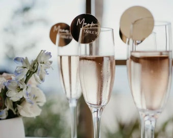 Custom Personalized Drink Charm, Wedding Glass Charms, Cocktail Names, Champagne Tags, Place Setting Wall , Seating Chart, Wine Charms, Colored Glass Tags, Iridescent sequin items Personalized Stemless Escort Card (Or place setting) Stirrers have been here for years and aren't going anywhere soon! We love these as much as you do :) Each Individual Stemless Escort Card Includes (up to): One first and last name, table number, and meal preference (for example: An order of 10 will have ten different names (Cards), one for each guest) Don't need table number and meal preference? Not a problem, these are to be used as place settings as well with just individual names! (Ordering instructions below) These gorgeous laser-cut etched personalized acrylic stemless card drink stirrers are absolutely stunning and create a memorable statement for any special event! Not only will these be a show stopping statement piece, they are an innovative way to display your event's seating chart AND serve as brilliant favors. Your wedding or event will be unforgettable with special details that leave your guests in awe. Our custom and personalized laser cut etched acrylic stemless escort card stir sticks can be placed on the rim of almost any glass of welcoming champagne to greet guests, placed along with your table settings for each guest, used as table décor, table place cards, photo props and so much more for a wedding or any special occasion. Not to mention, they are the best way to dress up any drink! ;) Custom Etched Acrylic Stemless Escort Card Drink Stirrers Each Individual Stemless Escort Card Includes (up to): One first and last name, table number, and meal preference (please see third and fourth photos in the listing for reference) (for example: An order of 10 will have ten different names (Cards), one for each guest) Don't need table number and meal preference? Not a problem, these are to be used as place settings as well with just individual names! -No minimums | How To Order | 1. Select the color 2. Select Quantity from the drop down menu (no min. no max), if you don't see your quantity, please let us know and we'll add the exact quantity you need :) 4. State the date needed in hand in the "Personalization Box" -When ordering, please leave guest list in notes to seller section at checkout OR After the order is placed, you can message us via etsy with your list or email (JennandJulesDesigns [!at] gmail.com) your guest list to us. ... whichever method is most convenient for you These specific drink tags are for the exact trendy and modern font shown in the listing photos. **Want a different shape of stirrer, font? Not a problem! Just send us a message and we can go from there! Our personalized etched acrylic stemless escort card drink stirrers will fit on the rim of a wide variety of champagne flutes and glassware of all shapes and sizes including shot glasses. Don't worry about paint or wood chipping; these long lasting gorgeous acrylic stemless escort card swizzle sticks are made from the best quality and 100% made in USA. We design and make all of our items with our own machines and hands, no outsourcing here! Please note that all mirrored acrylics have grey backings. Clear acrylic and frosted clear acrylic tags have frosted white etching and look best with a darker background. JUST ADDED: MIRRORED ROSE GOLD, Mirrored Bronze, midnight iridescent, nude blush, and sage green! Made in San Diego, CA ***Size*** 1.75" Diameter (Can be customized to be larger, message before ordering if you'd like a custom size) Please note, one thing these babes are not ...TOYS! Please keep away from those adorable children of yours! Other than that, have fun. Made with Shatterproof Acrylic ****COLORS**** More to come! Please note: Colors may vary on your computer screen and/or electronic devices such as cell phones. Don't see a color you like, please message us and we might just have it! If not? We can try to get you exactly what you are looking for! Custom Orders We love custom orders!!! Send us a message and we can chat about creating the perfect party necessity for your next event! First and 2nd Photo Credit: Kape Photography