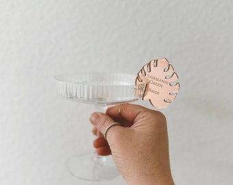 Monsterra leaf Personalized Drink Charm, Wedding Glass Charms, Cocktail Names, Champagne Tags, Place Setting Wall , Seating Chart, Wine Charms, Colored Glass Tags, Iridescent sequin items Personalized Stemless Escort Card (Or place setting) Stirrers have been here for years and aren't going anywhere soon! We love these as much as you do :) Shown in mirrored rose gold Each Individual Stemless Escort Card Includes (up to): One first and last name, table number, and meal preference (for example: An order of 10 will have ten different names (Cards), one for each guest) Don't need table number and meal preference? Not a problem, these are to be used as place settings as well with just individual names! (Ordering instructions below) These gorgeous laser-cut etched personalized acrylic stemless card drink stirrers are absolutely stunning and create a memorable statement for any special event! Not only will these be a show stopping statement piece, they are an innovative way to display your event's seating chart AND serve as brilliant favors. Your wedding or event will be unforgettable with special details that leave your guests in awe. Our custom and personalized laser cut etched acrylic stemless escort card stir sticks can be placed on the rim of almost any glass of welcoming champagne to greet guests, placed along with your table settings for each guest, used as table décor, table place cards, photo props and so much more for a wedding or any special occasion. Not to mention, they are the best way to dress up any drink! ;) Custom Etched Acrylic Stemless Escort Card Drink Stirrers Each Individual Stemless Escort Card Includes (up to): One first and last name, table number, and meal preference (please see third and fourth photos in the listing for reference) (for example: An order of 10 will have ten different names (Cards), one for each guest) Don't need table number and meal preference? Not a problem, these are to be used as place settings as well with just individual names! -No minimums | How To Order | 1. Select the color 2. Select Quantity from the drop down menu (no min. no max), if you don't see your quantity, please let us know and we'll add the exact quantity you need :) 4. State the date needed in hand in the "Personalization Box" -When ordering, please leave guest list in notes to seller section at checkout OR After the order is placed, you can message us via etsy with your list or email (JennandJulesDesigns [!at] gmail.com) your guest list to us. ... whichever method is most convenient for you These specific drink tags are for the exact trendy and modern font shown in the listing photos. **Want a different shape of stirrer, font? Not a problem! Just send us a message and we can go from there! Our personalized etched acrylic stemless escort card drink stirrers will fit on the rim of a wide variety of champagne flutes and glassware of all shapes and sizes including shot glasses. Don't worry about paint or wood chipping; these long lasting gorgeous acrylic stemless escort card swizzle sticks are made from the best quality and 100% made in USA. We design and make all of our items with our own machines and hands, no outsourcing here! Please note that all mirrored acrylics have grey backings. JUST ADDED: MIRRORED ROSE GOLD, Mirrored Bronze, midnight iridescent, nude blush, and sage green! Made in San Diego, CA ***Size*** 1.75" Diameter (Can be customized to be larger, message before ordering if you'd like a custom size) Please note, one thing these babes are not ...TOYS! Please keep away from those adorable children of yours! Other than that, have fun. Made with Shatterproof Acrylic ****COLORS**** More to come! Please note: Colors may vary on your computer screen and/or electronic devices such as cell phones. Don't see a color you like, please message us and we might just have it! If not? We can try to get you exactly what you are looking for! Custom Orders We love custom orders!!! Send us a message and we can chat about creating the perfect party necessity for your next event! First and 2nd Photo Credit: Kape Photography