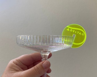 Tennis drink tag,logo Charm,Wedding Glass Charms,us open,Champagne Tags,Place Setting Wall,logo drink marker,Wine Charm Personalized Stemless Tennis Ball with Logo or Monogram Drink Tag First listing photo is shown in fluorescent green. Each Individual Stemless Tennis Drink Tag Includes Tennis Ball Etching and Logo or Monogram or Initials or custom text (or just tennis ball etching) These gorgeously fun laser-cut etched personalized acrylic stemless tennis ball drink stirrers are absolutely stunning and create a memorable statement for any special branded event! Not only will these be a show stopping statement piece, they are an innovative way to display your company logo AND serve as brilliant favors. Your wedding or event will be unforgettable with special details that leave your guests in awe. Our custom and personalized laser cut etched acrylic stemless card stir sticks can be placed on the rim of almost any glass of welcoming champagne to greet guests, placed along with your table settings for each guest, used as table décor, table place cards, photo props and so much more for a wedding or any special occasion. Not to mention, they are the best way to dress up any drink! ;) Custom Etched Acrylic Stemless Tennis Drink Stirrers -No minimums | How To Order | 1. Select the color 2. Select Quantity from the drop down menu (no min. no max), if you don't see your quantity, please let us know and we'll add the exact quantity you need :) 4. State the date needed in hand in the "Personalization Box" -When ordering, please leave any design details: text logo initials etc in the notes to seller section at checkout OR After the order is placed, you can message us via etsy with your details These specific drink tags are for the exact trendy and modern font shown in the listing photos. **Want a different shape of stirrer, font? Not a problem! Just send us a message and we can go from there! Our personalized etched acrylic stemless tennis card drink stirrers will fit on the rim of a wide variety of champagne flutes and glassware of all shapes and sizes including shot glasses. Don't worry about paint or wood chipping; these long lasting gorgeous acrylic stemless escort card swizzle sticks are made from the best quality and 100% made in USA. We design and make all of our items with our own machines and hands, no outsourcing here! Please note that all mirrored acrylics have grey backings. Clear acrylic and frosted clear acrylic tags have frosted white etching and look best with a darker background. JUST ADDED: MIRRORED ROSE GOLD, Mirrored Bronze, midnight iridescent, nude blush, and sage green! Made in San Diego, CA ***Size*** 1.75" Diameter (Can be customized to be larger, message before ordering if you'd like a custom size) Please note, one thing these babes are not ...TOYS! Please keep away from those adorable children of yours! Other than that, have fun. Made with Shatterproof Acrylic ****COLORS**** More to come! Please note: Colors may vary on your computer screen and/or electronic devices such as cell phones. Don't see a color you like, please message us and we might just have it! If not? We can try to get you exactly what you are looking for! Custom Orders We love custom orders!!! Send us a message and we can chat about creating the perfect party necessity for your next event!