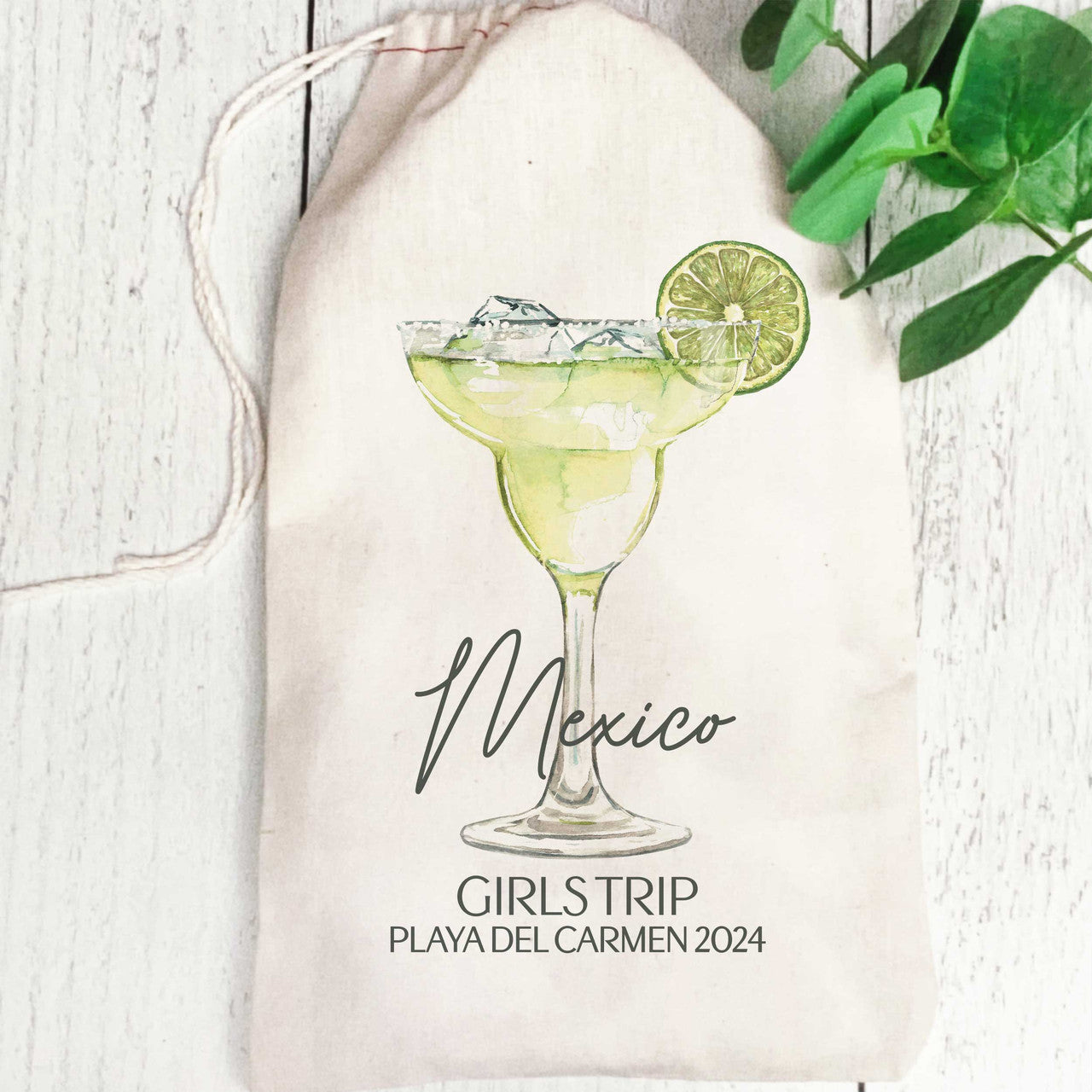 These custom margarita gift bags are perfect for a Mexico birthday, fiesta bachelorette party, or any other boozy get-together. Choose from 3 sizes of our best-selling drawstring bags and personalize this fun watercolor margarita design with your own custom text or names. Personalization Add a name or location (printed in script - use up to 12 characters) Add 1-2 lines of custom text (printed in non-script - 30 characters per line maximum) *Character limit includes spaces and punctuation *Custom text is printed in lettering styles shown *No accented letters, non-standard characters or symbols All customized items are made especially for you and are a final sale. Drawstring Bags 100% lightweight cotton canvas bag Drawstring closure Each bag will lose approximately 1" of height when closed Measurements are approximate, some variance is to be expected Digitally printed PLEASE NOTE: Due to variations in each device's display settings and calibration, printed colors may sometimes appear different or less bright than what you see on your screen.