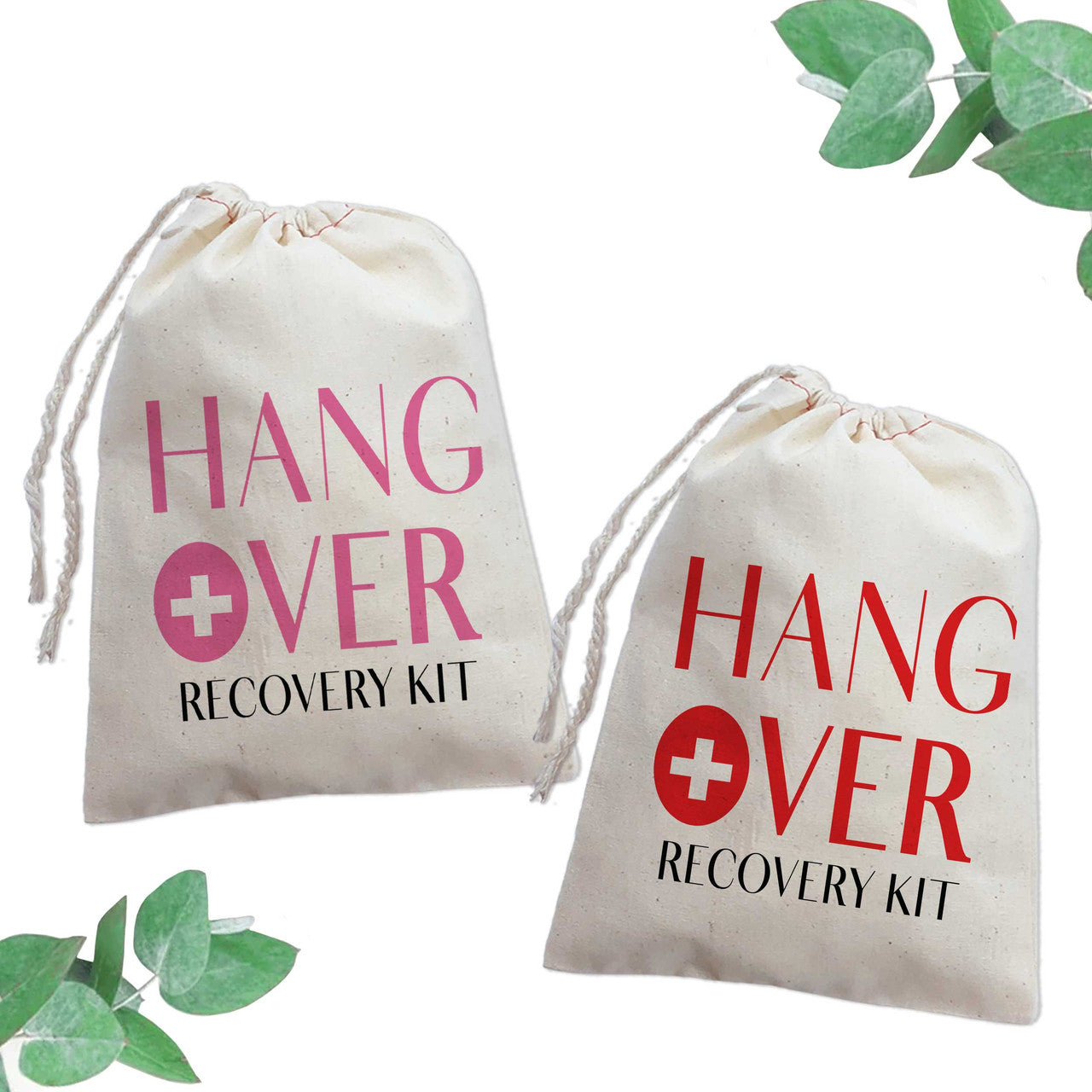These hangover kit bags are the perfect favor for a boozy bash. Each reusable 4" x 6" drawstring canvas bags comes with your choice of our pink or red "Hang Over Recovery Kit" design, and are just the right size for your favorite day after remedies or other small goodies. Drawstring Bags 100% lightweight cotton canvas bag Size: 4" x 6" Drawstring closure Each bag will lose approximately 1" of height when closed Measurements are approximate, some variance is to be expected Digitally printed PLEASE NOTE: Due to variations in each device's display settings and calibration, printed colors may sometimes appear different or less bright than what you see on your screen.