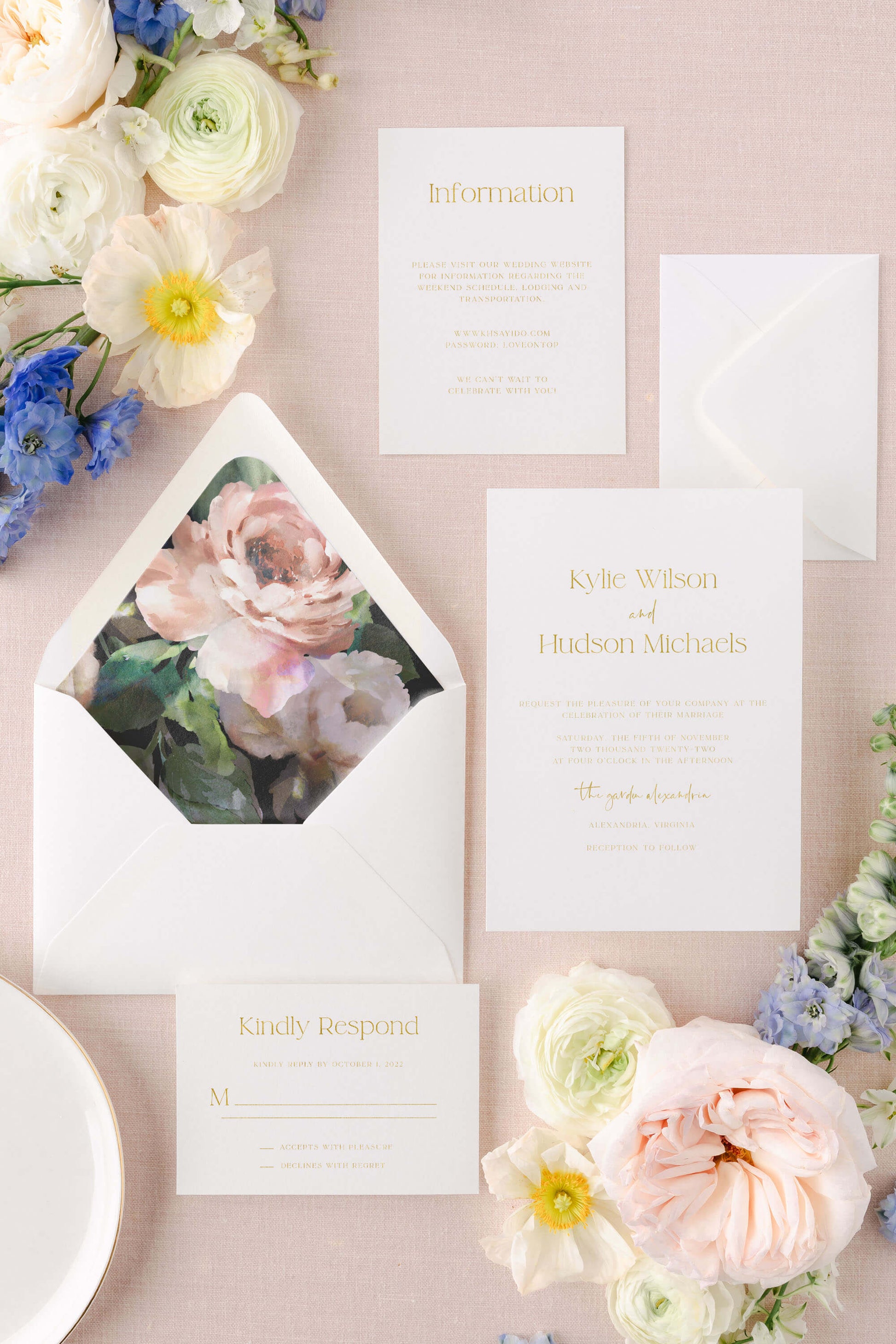 Starts from $1105 per 50 invitations Make a stunning impression with white and gold wedding invitations. Plan an elevated wedding with our gorgeous gold foil wedding invitation cards. These designer invitations seamlessly combine modern style with a touch of classic sophistication, perfect for couples who appreciate enduring luxury. Personalize them to align with your unique style and wedding theme. Combine these gold wedding invitations with the Kylie Stationery Suite for a cohesive and personalized atmosphere throughout your event. From the initial announcement to the final expression of gratitude, each detail will mirror your distinct aesthetic, ensuring a cohesive and memorable experience. Enhance your experience with complimentary ground shipping on all orders. Because your journey to forever deserves the finest in gold wedding invitations without the extra cost.