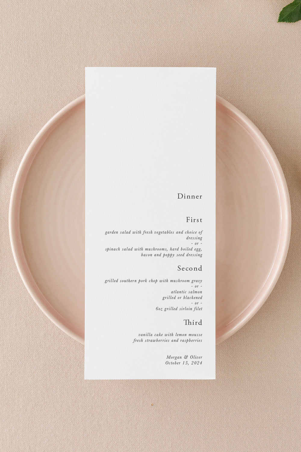 Starts from $260 per 25 cards. This elegant wedding menu card is perfect for the bride with a classic, timeless style. Enhance your event's aesthetic with the entire Morgan Stationery Suite that complements this luxurious menu.
