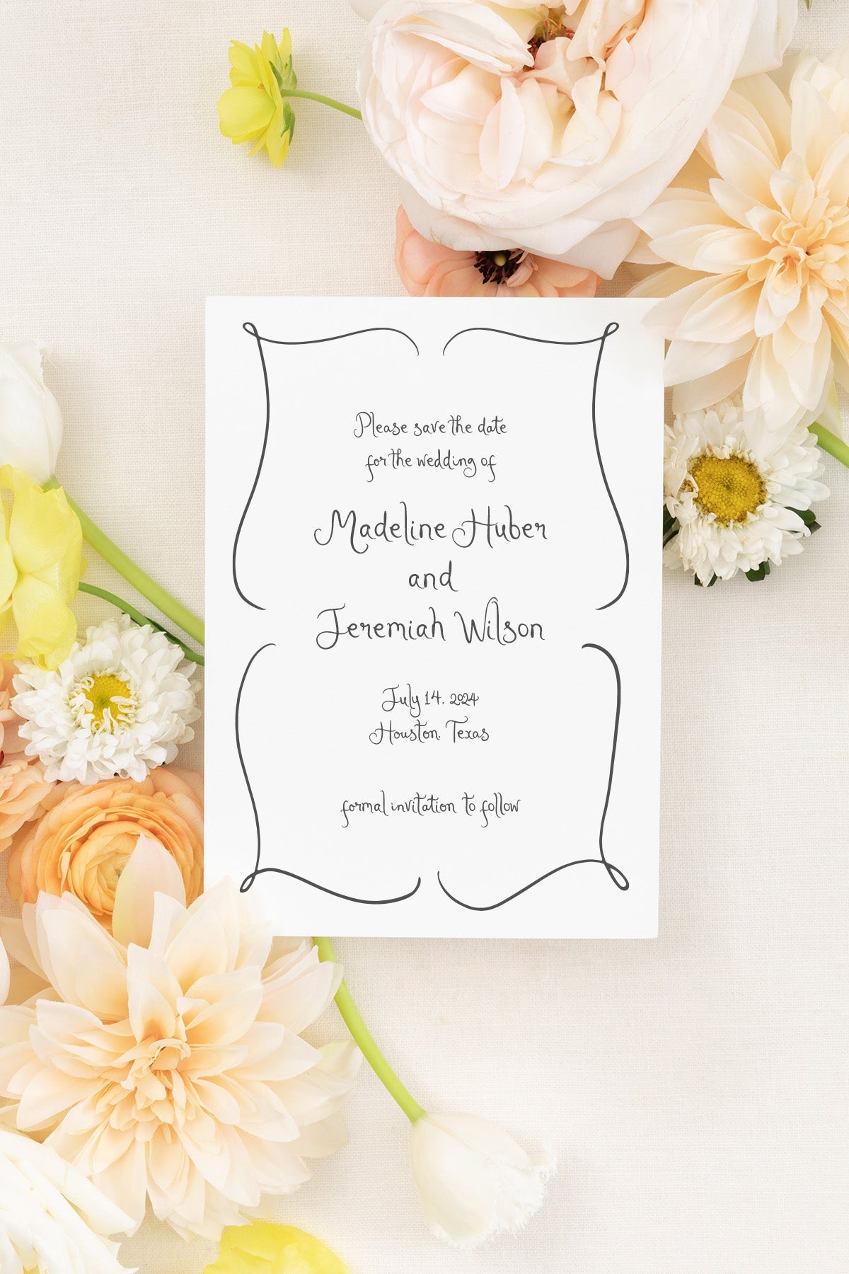 Starts from $525 per 50 cards. Whimsical save the dates! Perfect for the bride who loves unique, elegant details and an overall sophisticated feel that starts a dream wedding off the right way. Coupled with the whole Madeline Stationery Suite, these romantic save-the-dates will help you carry your whimsical style throughout your entire wedding€”from save the date to wedding welcome signs and beyond. Please Note: While text is customizable, the design elements and layout are not. Enjoy complimentary ground shipping on all orders.