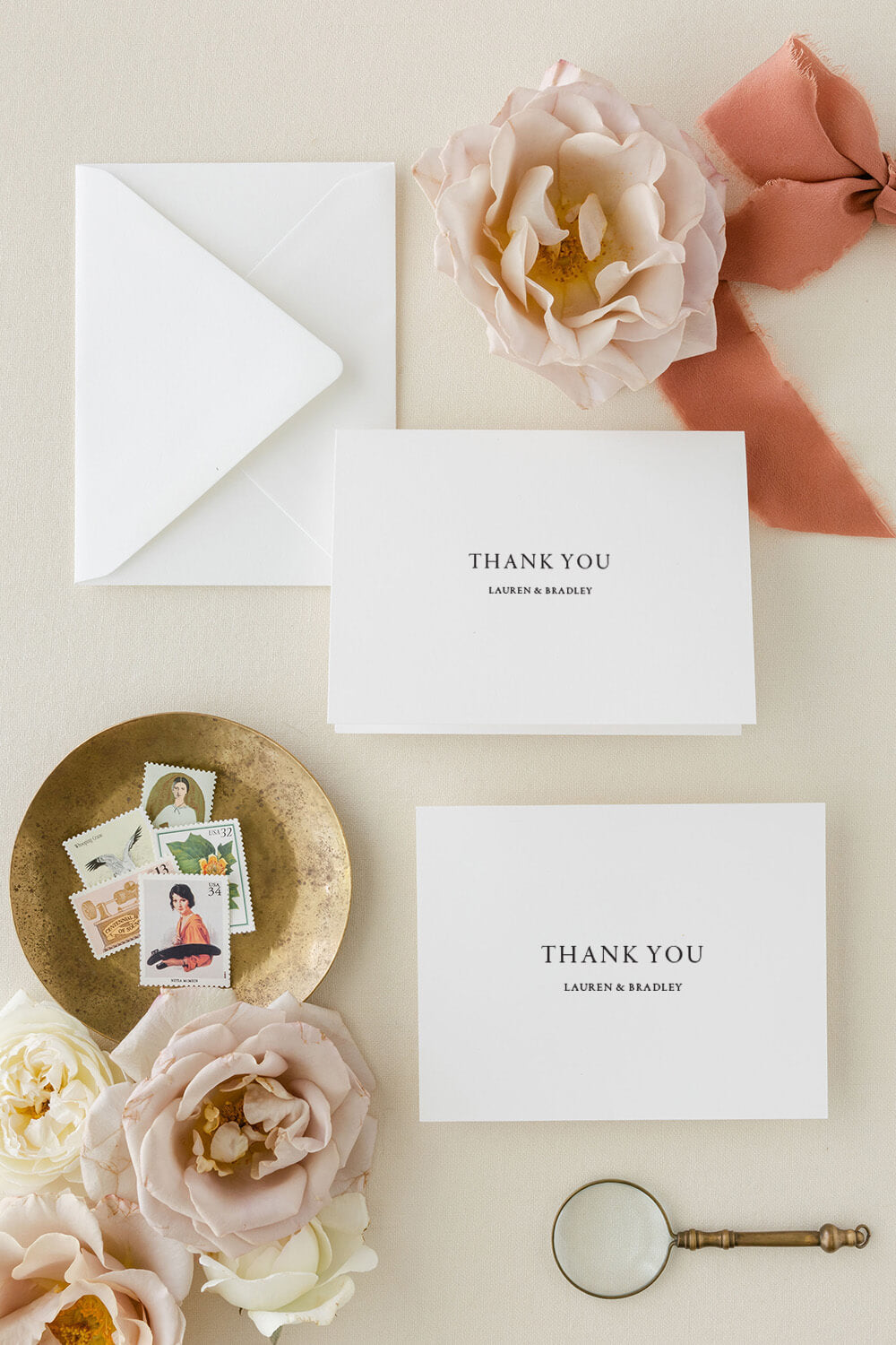Starts from $178 per 25 cards. After the celebration concludes, don't forget to thank your guests! Our wedding thank you cards will help you do just that with elegance and style. These personalized wedding thank-you notes are customized with your names and professionally printed. With a folded card size of 4.25" x 5.5", matching envelopes, and a printed return address, this is the easiest way to show gratitude to your guests for their presence and well-wishes.
