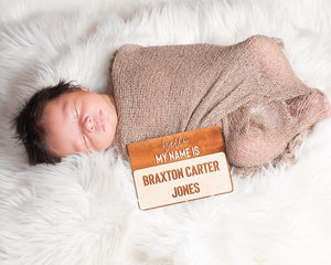 Add a unique, modern touch to your baby's first hospital photos + announce your new little babe in style with this "hello my name is" wooden sign! Each sign is cut out + engraved on 1/8" baltic birchwood, and measures 5.5" wide + 4" tall. These signs also makes the perfect room decor or baby shower gift + are great as a keepsake that will last for years to come. To order, please choose either the all caps font as pictured or custom calligraphy hand lettered by myself for +$2. All calligraphy will be written in lowercase unless specifically stated at checkout. Enter the following details in the personalization box--you can choose from one of the following: First Name First + Last Name First + Middle Name First, Middle + Last Name *If you are doing the first, middle & last name and have a preference on which lines the names go on (for instance if you want the first and middle name on the first line and last name on the second line) please let me know. Otherwise I will create the name tag as it best fits, generally with first name on the first line, and middle and last name on the second line.* Need your order rushed or need your order delivered by a certain date? Shoot me a message to discuss! Due to the nature of the wood, each piece is unique in color, shade & grain and no two signs will be alike. Color varies on individual computer screens, I cannot guarantee color unless a sample is requested. These wooden signs are not intended as a toy and must be used under adult supervision. ** PLEASE NOTE: due to the handmade nature of the items listed in my shop, items may differ slightly from the pictures posted. All items are made to order unless otherwise noted.**