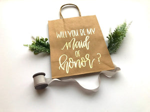 This listing is for one 8"x10" hand lettered "will you be my maid of honor?" bag that is embossed on a kraft paper bag perfect for popping the question to your MOH! This hand lettered bag is embossed in gold which is raised, glossy and permanent. Also available in white lettering, blush pink, or black. Looking for a different color or wording? Let's chat! I'd love to do a custom bag for you! Please make sure to include the number of bags you would like before checkout. For larger orders, please contact me for discounted pricing & shipping rates. **PLEASE NOTE: due to the handmade nature of the items listed in my shop, items may differ slightly from the pictures posted. All items are made to order unless otherwise noted.**
