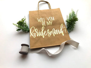 This listing is for one 8"x10" hand lettered "will you be my bridesmaid?" bag that is embossed on a kraft paper bag perfect for popping the question to your wedding party! This hand lettered bag is embossed in gold which is raised, glossy and permanent. Also available in white lettering, blush pink, or black. Looking for a different color or wording? Let's chat! I'd love to do a custom bag for you! Please make sure to include the number of bags you would like before checkout. For larger orders, please contact me for discounted pricing & shipping rates. **PLEASE NOTE: due to the handmade nature of the items listed in my shop, items may differ slightly from the pictures posted. All items are made to order unless otherwise noted.**
