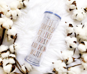 This listing is for one 16 oz skinny acrylic tumbler that reads 'I'll surprise my liver today and drink water'. It can be completely customized with your name, short quote, initials, or wording! These tumblers makes the perfect bridal party or bachelorette gift, birthday gift or just a gift to treat yourself! Each tumbler is cut out on high quality, permanent vinyl that is adhered to the outside of the tumbler. The tumblers are 8.5" tall, 2.75" in diameter & hold 16 oz. of liquid. Please note, these tumblers are NOT dishwasher or microwave safe. I recommend gently hand washing with warm soapy water [do not soak] and to handle with care to extend the life of your tumbler. If you would like your tumbler personalized, when ordering please place the wording you would like to say on your tumbler in note to seller--please note I am not responsible for spelling errors and I will letter exactly what is written in note to seller. If your quote is too large to fit on the tumbler, I will contact you to discuss other options. If you are ordering 6 or more tumblers, please contact me for a discount & shipping rates. The colors I have available are: rose gold foil, metallic gold foil, metallic pink foil, metallic purple foil, flamingo pink, brushed copper, black, white, blush pink, metallic silver foil & matte gold. All names will be written in lowercase unless specifically stated at checkout. Need it sooner? Contact me for a rush order! ** PLEASE NOTE: due to the handmade nature of the items listed in my shop, items may differ slightly from the pictures posted. All items are made to order unless otherwise noted.**