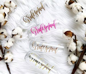 This listing is for one stemless glass champagne flute that reads "bridesmaid". This glass makes the perfect bridal party gift for all of the special ladies that will stand by your side on your wedding day! Each glass is hand lettered by myself [not a font] & cut out on high quality, permanent vinyl that is adhered to the outside of the glass. The glasses stand 5 3/4" tall, 1 3/4" in diameter, and hold 8 oz. of liquid. Please note, these glasses are NOT dishwasher or microwave safe. I recommend gently hand washing with warm soapy water [do not soak] and to handle with care to extend the life of your glasses. If you are ordering 6 or more glasses, please contact me for a discount & shipping rates. The colors I have available are: rose gold foil, metallic gold foil, metallic pink foil, metallic purple foil, flamingo pink, brushed copper, black, white, blush Pink, metallic silver foil & matte gold. Looking for the glasses to be personalized with your bridesmaid's names or different wording? Let's chat! I would be more than happy to do custom glasses for you! All names will be written in lowercase unless specifically stated at checkout. Need it sooner? Contact me for a rush order! ** PLEASE NOTE: due to the handmade nature of the items listed in my shop, items may differ slightly from the pictures posted. All items are made to order unless otherwise noted.**