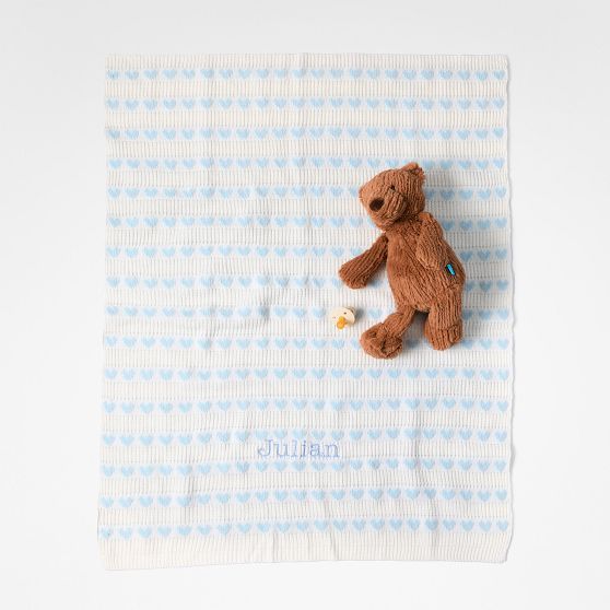 Wrap your little one up in our cozy knit hearts blanket, crafted from soft, breathable fabric for the right amount of warmth for all-season comfort. The timeless heart pattern adds a touch of charm, making it perfect for snuggles, stroller rides or as a nursery accent. Embroider baby's name for a thoughtful and unique keepsake.