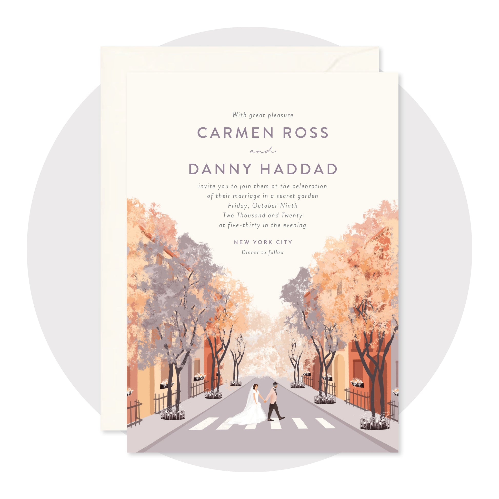 Wow your guests with unique, semi-custom illustrated wedding invitations! Here you can purchase a lovely printable save the date, main invite, or full stationery suite featuring an illustrated portrait of the engaged couple walking through the city. This backdrop is perfect for any city wedding€“including a New York City wedding, Chicago wedding, or London wedding. Customizable Features Include: €¢ All text (client will be asked to provide a script) €¢ Hair color/cut of Bride/Groom €¢ Skin color of Bride/Groom €¢ Body shape of Bride/Groom €¢ Glasses can be added to one or both €¢ Client will be asked to provide a photo of the bride/groom to match custom requests. All illustrations are meant to be a loose resemblance of the couple and will not be an identical match. If additional customizations are required, please inquire prior to purchasing. Additional fees may apply for any customizations not listed above. If you'd rather have a completely customized invite (specific background location, pose for the couple, etc) please message us for a quote! Merimoi Press has figured out a way to make ordering custom invites easy for you! All you need to do is provide the details and we do all of the personalization for you. Within 7-10 business days, you'll receive gorgeous, ready-to-print, digital files. You can easily print your stationery at home OR at any copy shop or online printer. If you'd prefer to have Merimoi Press professionally print your invites for you, please check out our printed semi-custom invites. We'd love to help make the printing process easier for you!