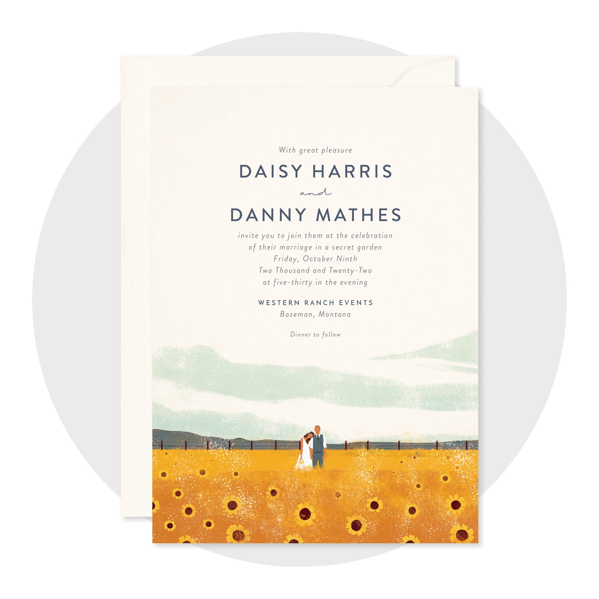 Wow your guests with unique, semi-custom illustrated wedding invitations! Here you can purchase a lovely printable save the date, main invite, or full stationery suite featuring an illustrated portrait of the engaged couple standing in a beautiful field of sunflowers. This backdrop is perfect for a rustic wedding, country wedding or barn wedding. Customizable Features Include: €¢ All text (client will be asked to provide a script) €¢ Hair color/cut of Bride/Groom €¢ Skin color of Bride/Groom €¢ Body shape of Bride/Groom €¢ Glasses can be added to one or both €¢ Client will be asked to provide a photo of the bride/groom to match custom requests. All illustrations are meant to be a loose resemblance of the couple and will not be an identical match. If additional customizations are required, please inquire prior to purchasing. Additional fees may apply for any customizations not listed above. If you'd rather have a completely customized invite (specific background location, pose for the couple, etc) please message us for a quote! Merimoi Press has figured out a way to make ordering custom invites easy for you! All you need to do is provide the details and we do all of the personalization for you. Within 7-10 business days, you'll receive gorgeous, ready-to-print, digital files. You can easily print your stationery at home OR at any copy shop or online printer. If you'd prefer to have Merimoi Press professionally print your invites for you, please check out our printed semi-custom invites. We'd love to help make the printing process easier for you!