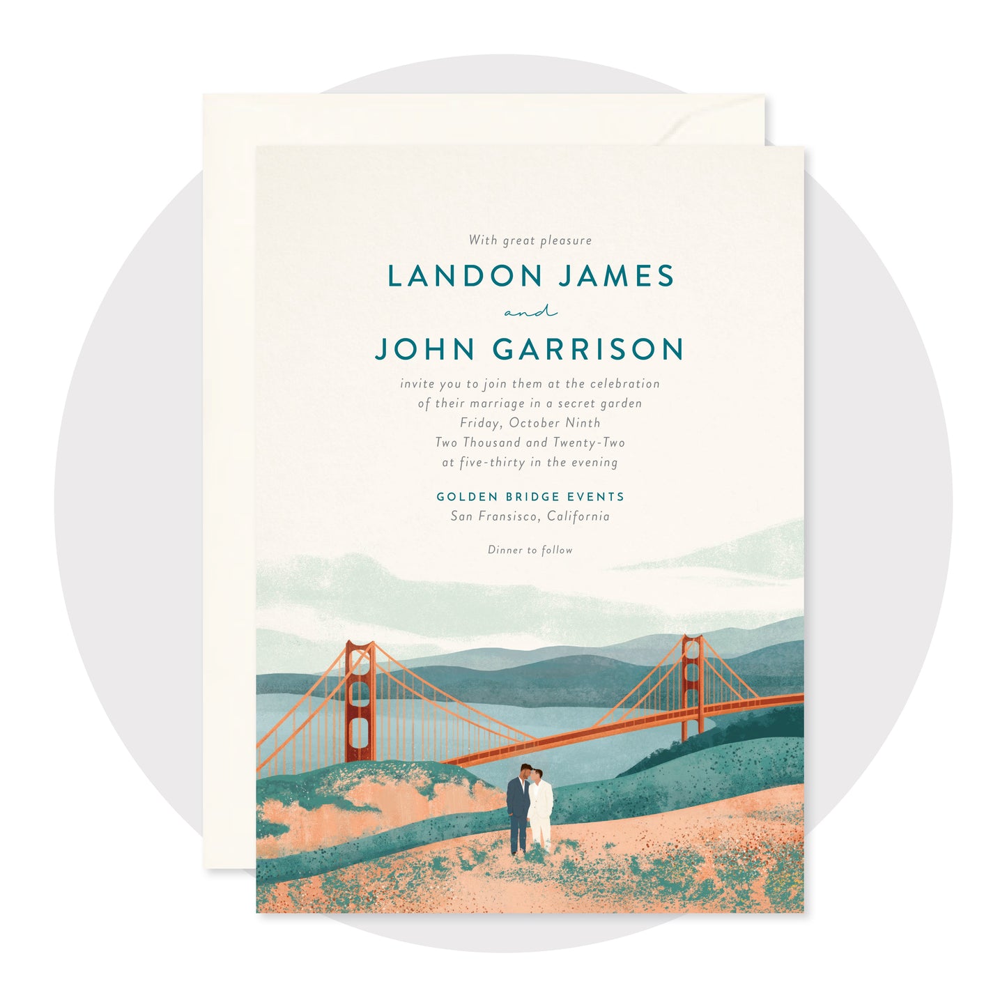 Wow your guests with unique, semi-custom illustrated wedding invitations! Here you can purchase a lovely printable save the date, main invite, or full stationery suite featuring an illustrated portrait of the engaged couple standing in front of the Golden Gate bridge in San Francisco. This backdrop is perfect for a city wedding or destination wedding in San Francisco. Customizable Features Include: €¢ All text (client will be asked to provide a script) €¢ Hair color/cut of Bride/Groom €¢ Skin color of Bride/Groom €¢ Body shape of Bride/Groom €¢ Glasses can be added to one or both €¢ Client will be asked to provide a photo of the bride/groom to match custom requests. All illustrations are meant to be a loose resemblance of the couple and will not be an identical match. If additional customizations are required, please inquire prior to purchasing. Additional fees may apply for any customizations not listed above. If you'd rather have a completely customized invite (specific background location, pose for the couple, etc) please message us for a quote! Merimoi Press has figured out a way to make ordering custom invites easy for you! All you need to do is provide the details and we do all of the personalization for you. Within 7-10 business days, you'll receive gorgeous, ready-to-print, digital files. You can easily print your stationery at home OR at any copy shop or online printer. If you'd prefer to have Merimoi Press professionally print your invites for you, please check out our printed semi-custom invites. We'd love to help make the printing process easier for you!