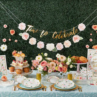 Features and Facts: Color(s): Pink, Gold, Green, and White Details: Banner 1 is composed of a pink watercolor rose on either side of gold foil script message that reads "Time to Celebrate". Banner 2 is a pre-strung strand of pink, peach, and white watercolor roses. Sign 1 is a white cardstock 11 x 14 sign that has a floral watercolor pattern and a gold foil message printed in the center that reads "Welcome! Brunch & Bubbly". Sign 2 is a horizontal sign with the same floral water color pattern with message "Enjoy! Dessert Bar" in metallic gold foil in the center. Dimensions: Banner: 5.1" w x 106.3" d x 0.01" h | Signs: 10.8" w x 14" d x 0.01" h | Packaged: 11.42" w x 14.57" d x 0.2" h Selling Unit: Set (2 banners and 2 11x14 cardstock signs) Minimum Quantity Without Personalization: 1 Set Minimum Quantity With Personalization: N/A Assembly Required: None