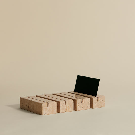 About the Large Travertine Place Card Holders, Set of 4: Elevate your tablescape with name card holders carved from a solid block of travertine. These holders are not just functional; they are also decorative pieces that reflect a commitment to quality and style. Product Dimensions: Dimensions: length 4.00"� x width 1.30"� x height 1.00"� Card Holder Opening: 0.125"� Stone Weight: 0.46 lbs Set of four card holders About the Travertine Stone Series: Hand-finished: made in small batches Limited edition: limited production and restocks Sustainable gift packaging: secured in recyclable, white box Naturally unique: color/size may vary due to variances in travertine stone Care: wipe with damp cloth Not watertight: travertine stone is porous and cannot hold water