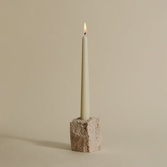 About the Small Travertine Candlestick Holder: Skilled craftsmanship transforms a block of natural travertine into a functional work of art. Product Dimensions: Dimensions: height 3.00"� x diameter 2.50"� Top Neck Opening: 1.00"� Stone Weight: 1.00 lbs Recommended Taper Candle Diameter: 0.90"� Candle holder sold individually without candle Dimensions/weight vary due to hand-crafted process About the Travertine Stone Series: Hand-finished: made in small batches Limited edition: limited production and restocks Sustainable gift packaging: secured in recyclable, white box Naturally unique: color/size may vary due to variances in travertine stone Care: wipe with damp cloth Not watertight: travertine stone is porous and cannot hold water