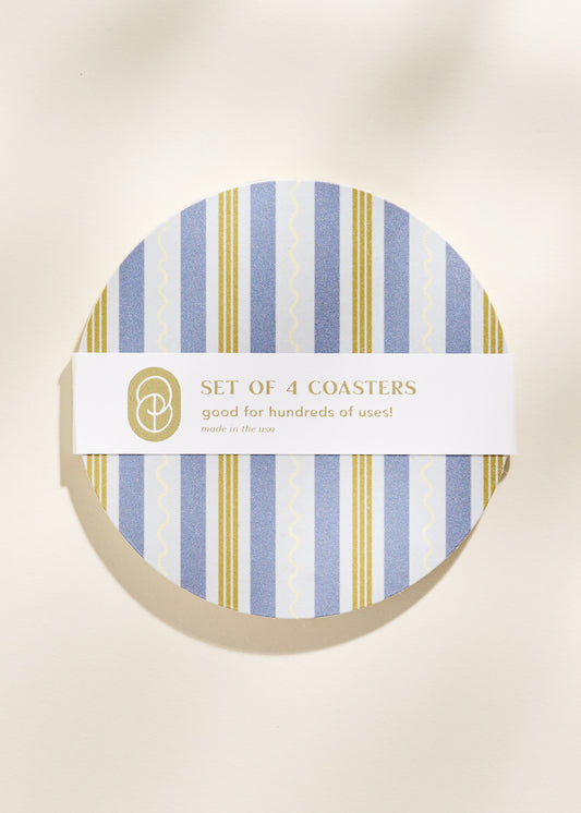 Reuseable and absorbent, these coasters will last you for months, and look stylish while soaking up any drips. Set of four 60 pt chipboard coasters, measuring 3.7 inches. Made in the USA. Our coasters are comprised of wood pulp, made exclusively with shavings from sustainable forestry. They are printed with UV ink, and packaged with a foil-pressed belly band made of recycled cotton paper.
