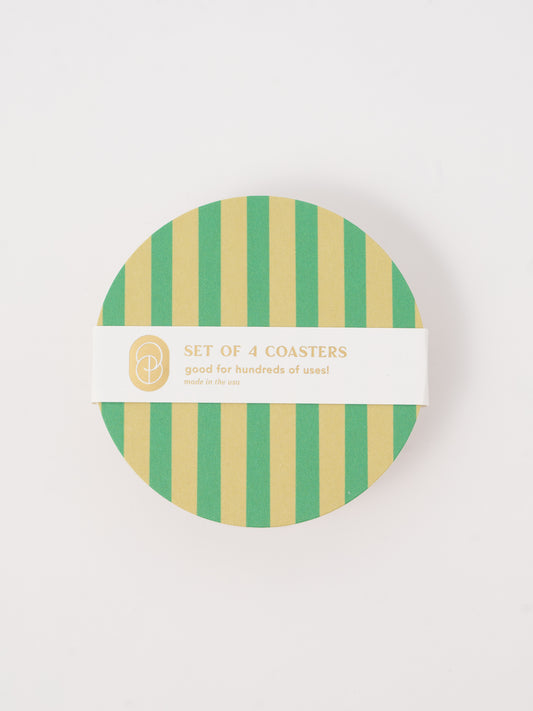 Reuseable and absorbent, these coasters will last you for months, and look stylish while soaking up any drips. Set of four 60 pt chipboard coasters, measuring 3.7 inches. Made in the USA. Our coasters are comprised of wood pulp, made exclusively with shavings from sustainable forestry. They are printed with UV ink, and packaged with a foil-pressed belly band made of recycled cotton paper.