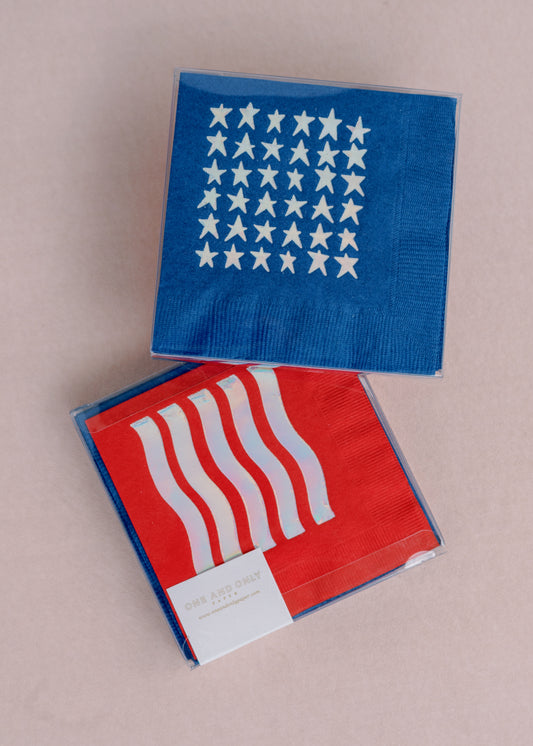 Celebrate in style with this split set of paper napkins. Featuring 10 star napkins and 10 stripe napkins, these are a fun way to enjoy the holiday. These cheeky cocktail napkins make a great hostess gift. Set of 20 3 ply napkins with silver holographic foil printing. Measures roughly 5 x 5 inches, and will arrive packed in a clear box.
