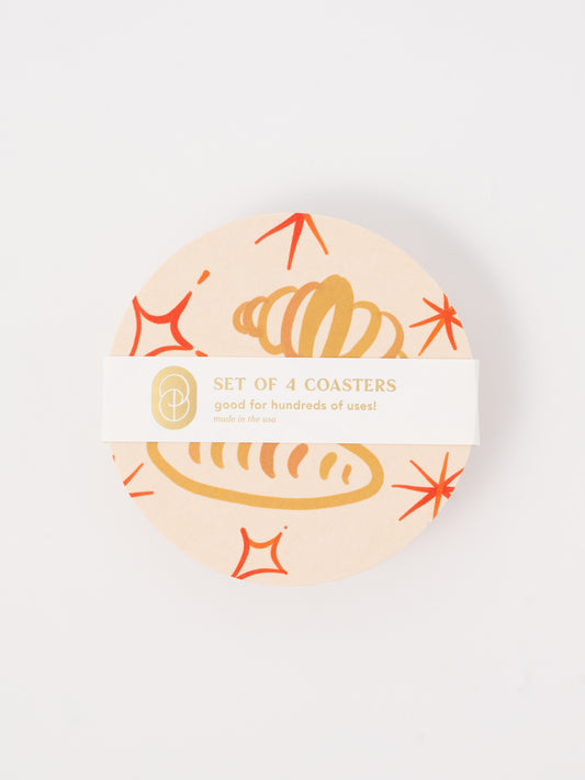 Reuseable and absorbent, these coasters will last you for months, and look stylish while soaking up any drips. Set of four 60 pt chipboard coasters, measuring 3.7 inches. Made in the USA. Our coasters are comprised of wood pulp, made exclusively with shavings from sustainable forestry. They are printed with UV ink, and packaged with a foil-pressed belly band made of recycled cotton paper.