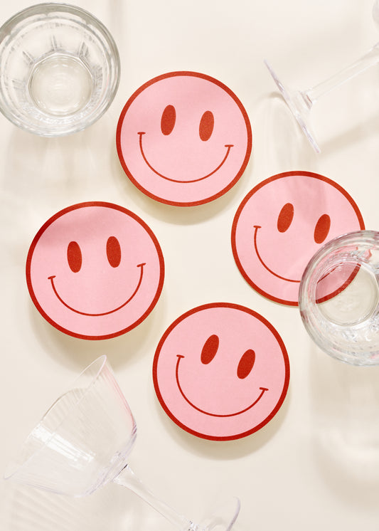 A retro 90s vibe with a fun and modern color palette, guaranteed to add a smile to any surface! Reuseable and absorbent, these coasters will last you for months, and look stylish while soaking up any drips. Set of four 60 pt chipboard coasters, measuring 3.7 inches. Made in the USA. Our coasters are comprised of wood pulp, made exclusively with shavings from sustainable forestry. They are printed with UV ink, and packaged with a foil-pressed belly band made of recycled cotton paper.