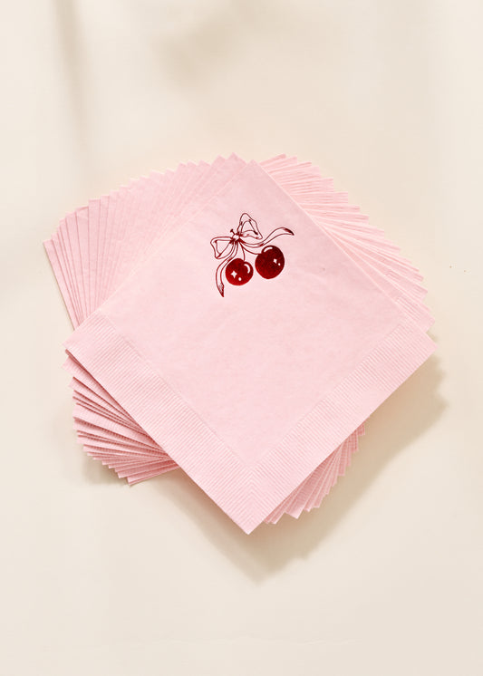 Add a sweet and playful touch to your Valentine's celebration with these blush pink cocktail napkins featuring charming cherry illustrations tied with a delicate bow. This set of 20 durable, 3-ply napkins is just right for cocktails, snacks, and all your party moments. Measuring 5 x 5 inches and packaged in a simple, plastic-free white box, they make a great gift€”or a fun addition to your own bar setup!