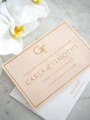 Elegant Save the Date card custom designed for our couple includes champagne suede 400gsm card with rose gold foil printing. Features: - Rose Gold foil custom design, custom monogram. - Premium ivory envelope in textured stock for a luxe feel and high quality print. - Option to change your foil colours and card colours available. (Suede colours available: White, champagne, navy, black, pink, purple, burgundy, grey, turquoise and many more....