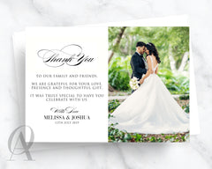 Send love and thanks to your family and friends with wedding photo thank you cards. Photos are a beautiful way for you and your guests to reflect on the magic from your wedding day. Simply choose your favourite photo to complement your thank you message, and we'll customise the card in your preferred style. Features: - 1 photograph in colour or black and white. - Personalised thank you message. - Brilliant print on thick 350gsm matte card. - Celloglaze laminate to increase durability and create a smooth and silky finish. - Blank envelopes.