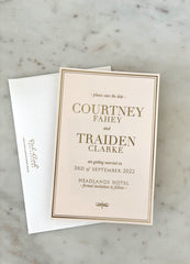 Save the Date card custom designed with timeless typography in gorgeous gold foil. The simple design will suit any modern and elegant wedding. Features: - Premium 250gsm matte stock for a luxe feel and high quality print. - Card stock in a chic light blush colour. - Blank envelopes