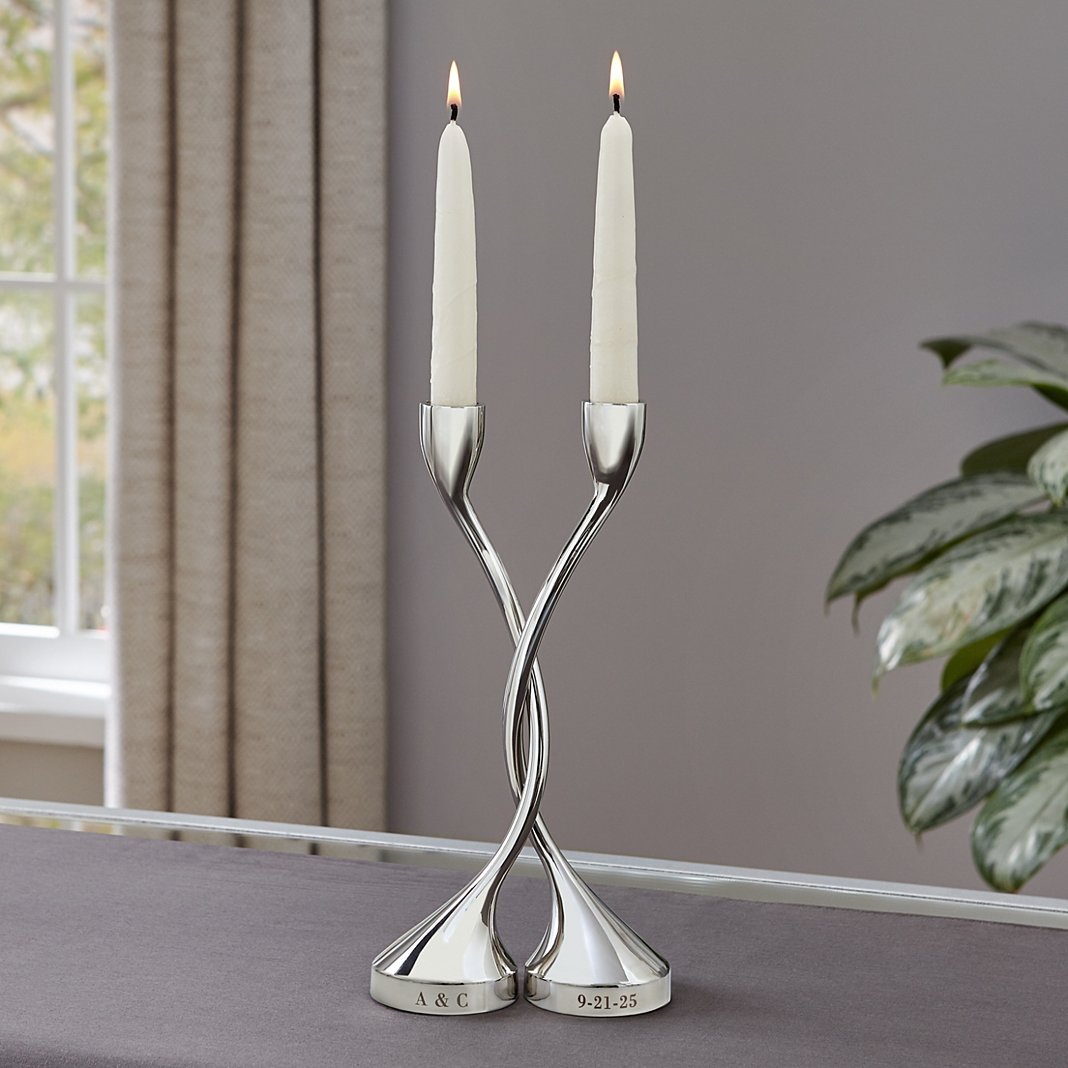Like two kindred spirits linked together in a loving embrace, this graceful pair will create a romantic focal point wherever they are displayed. Exclusively from RedEnvelope. Made of zinc alloy Measures 10.25”Hx2.5” dia Fits candle size of 3/4" in dia. Engrave each candlestick with any message up to 8 characters Candles not included