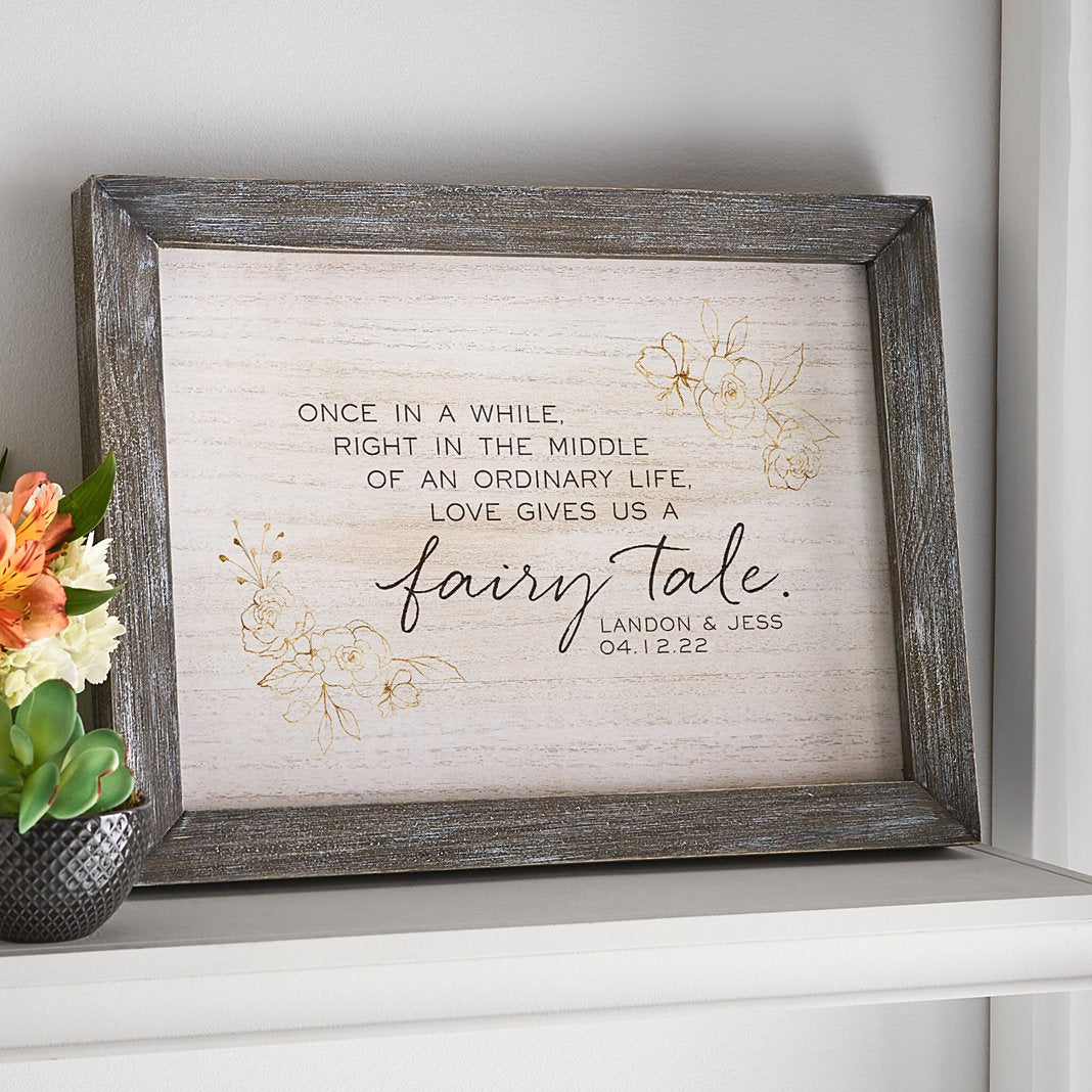 Fairy tales do come true! The gift of a love that lasts forever is sweetly expressed on this delicately pretty plaque surrounded by a rustic wood frame. Exclusively from RedEnvelope. Barnwood frame with MDF wood insert Includes sawtooth hanger Measures 12"Hx16"Wx1.5"D Personalize with any one or two line message up to 25 characters each “fairy tale.” will always appear