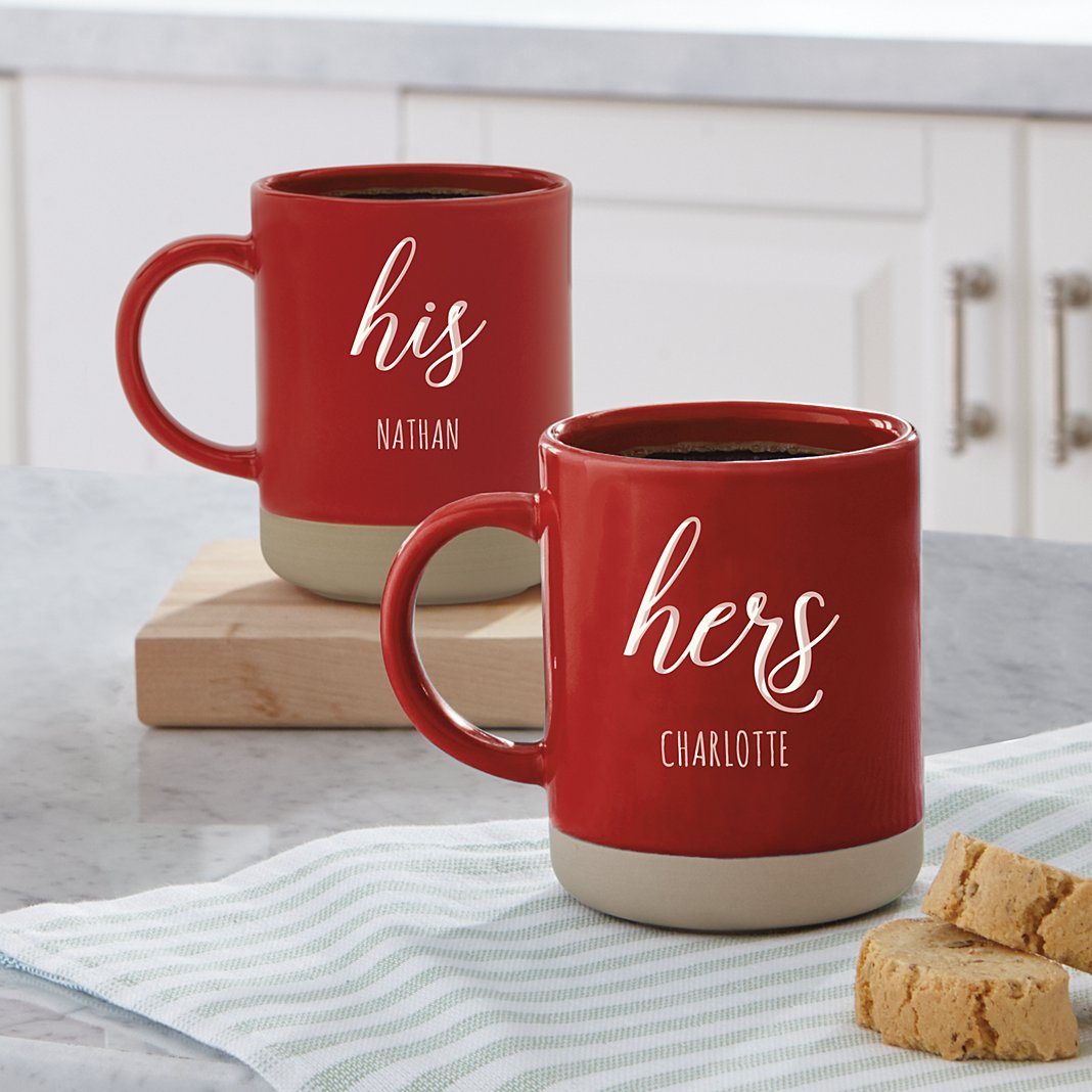 Coffee, tea… to each their own with this set! There's one for each of you. These substantial stoneware mugs are generously sized and have a textured bottom that contrasts beautifully with the smooth glaze. Includes a Classic Milk Chocolate Bomb drizzled with white chocolate that you can share together. Now that's a sweet moment for two! Made of stoneware with beautiful braised bottom Personalize with any title up to 8 characters and name or message up to 16 characters Sold as a set of 2 Available in red and blue Milk Chocolate Bomb: milk chocolate shell filled with hot chocolate mix and marshmallows drizzled with white chocolate Single serving Mug holds 15 oz. Measures 4.44"Hx3.44" dia. Dishwasher, freezer, oven and microwave safe