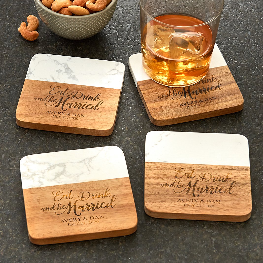 The marble and wood of these elegant coasters go together perfectly—just like your favorite newlyweds! Theyll make a wonderful addition to all the parties theyll throw in their new home. Exclusively from Personal Creations. Made of acacia wood and faux marble Due to natural variation of wood and marble, each coaster will be unique Set of 4, each measures 4" sq.