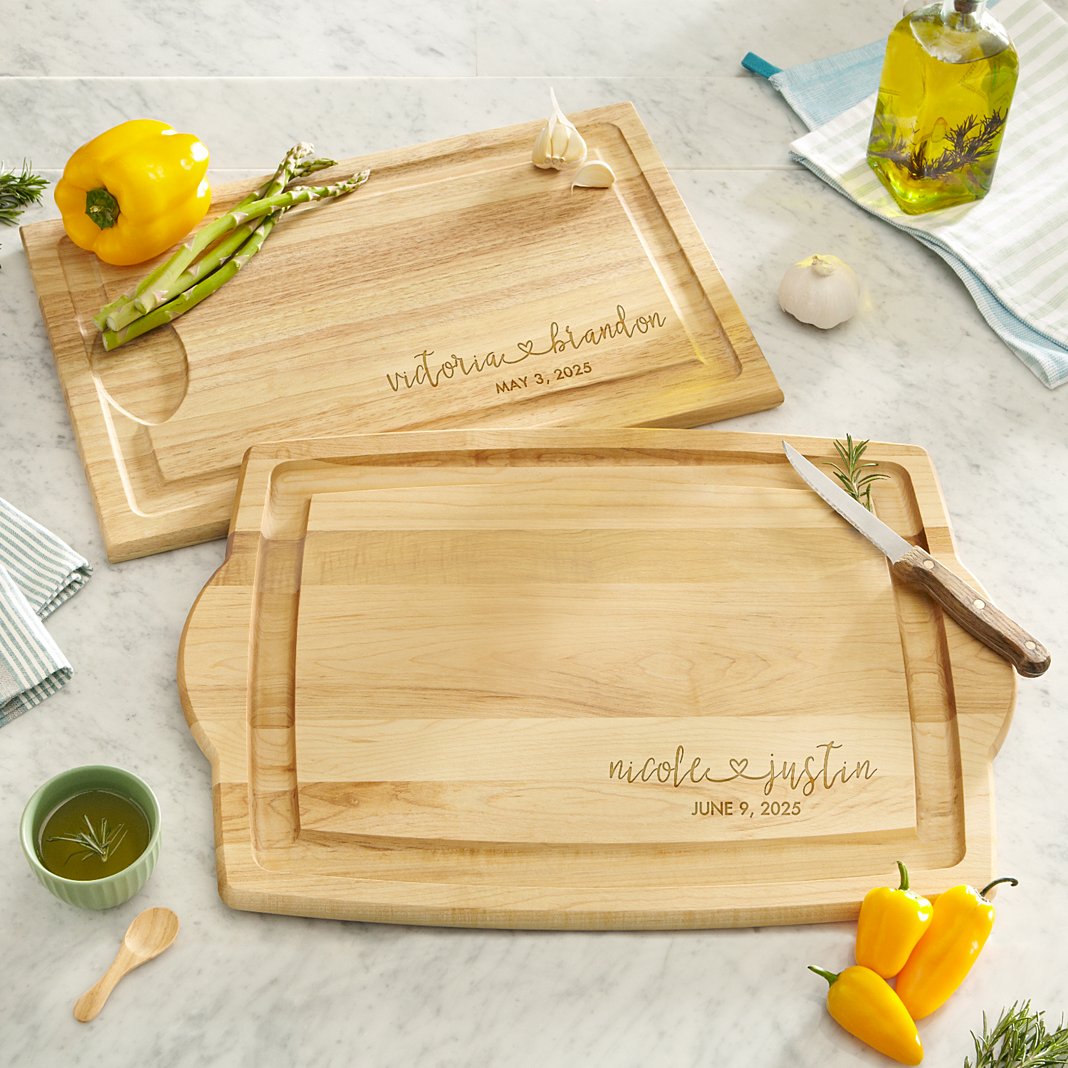 Some say cooking is the universal language of love. What better way to let your favorite foodie know your heart is all about them today - and every day - than with a customized cutting board. Nothing says love like food. Say it from the heart and personalize with any two names up to 10 characters each name and any message up to 25 characters Made of durable maple wood Available in 2 sizes; Small measures 12"x18" and Oversized measures 14"x20" Gift box not available