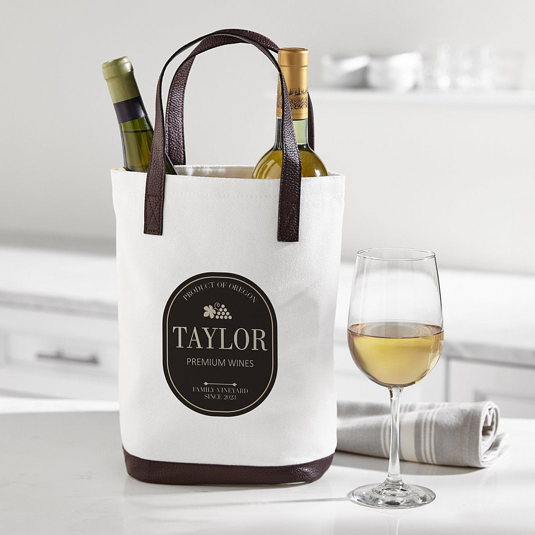 Bringing or gifting more than 1 bottle? No problem. This charming tote is designed to securely hold 2 wine bottles so they get where theyre going intact. Artfully personalize with any top message up to 20 characters, any name up to 12 characters and any 2-line message up to 20 characters on the first line and up to 18 characters on the second line Choose red or gray Made of 100% cotton with polyurethane trim Holds 2 standard-sized (750ml) bottles Measures 14"Wx17"Hx4"D Spot clean