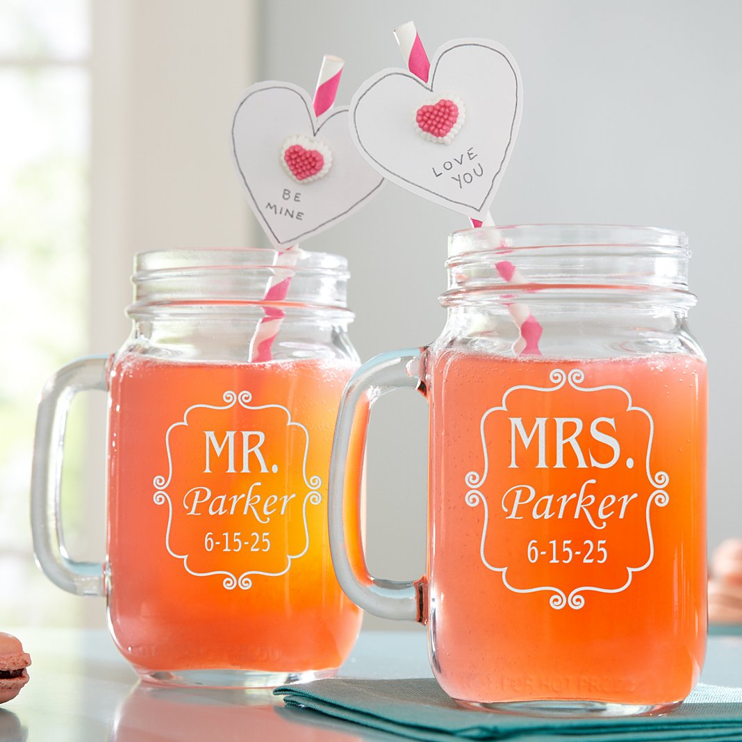 Perfect drinkware for the unpretentious newlyweds, our spirited Mason jar drinking mugs each hold a pint of their favorite brew. Now designed to accommodate hyphenated names. Made of glass Holds 16 oz Measures 5"H Dishwasher safe Set of 2 mugs Laser engraved with any two last names, up to 12 characters each, and any numeric date Hyphen not included. Must include at end of “Jar 1 Last Name 1” Straws not included
