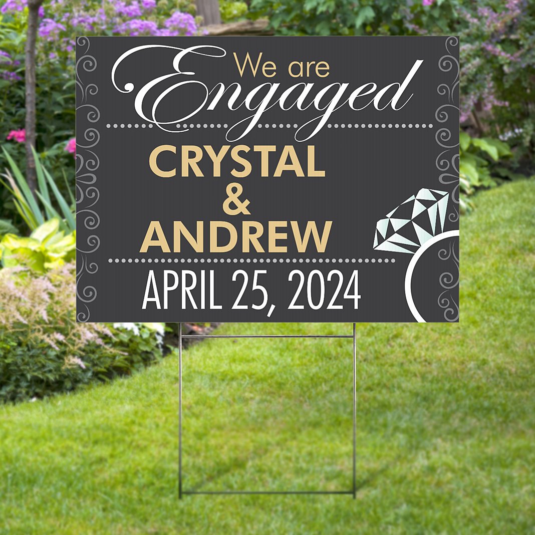 Heres to a knot just waiting to be tied! Salute a very special couple you know with this celebratory yard sign. Made of high-quality 4MM white corrugated plastic Includes silver “H” yard stick for display Sign measures 18"x24" Prints from edge to edge with vibrant colors Available in 1 or 2 sided print Personalize with any photo and any 3 line message up to 12 characters each and 1 line message up to 25 characters Full edge to edge printing with vibrant colors 2 sided print design reflects the same on both sides Item cannot be gift boxed