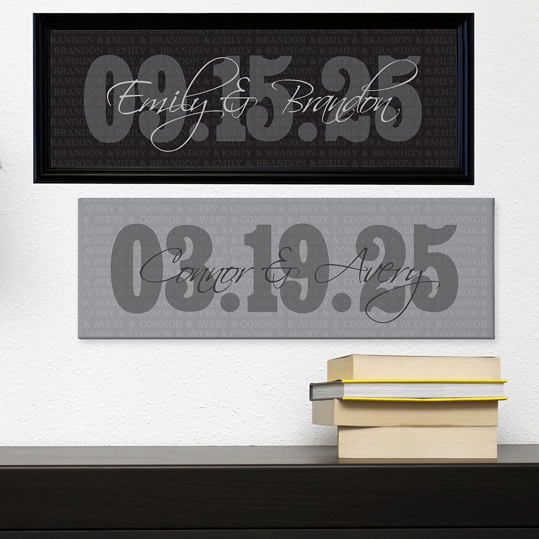 When it comes to a wedding date, numbers carry extra meaning—as proved by this stylish artwork. Canvas is stretched over a solid wood frame Sawtooth hanger included Framed option only Available in 9x27 size Personalize with any any message, up to 24 characters each and numeric date Item cannot be gift boxed Due to size and packaging requirements, item will ship separately from other items in your order