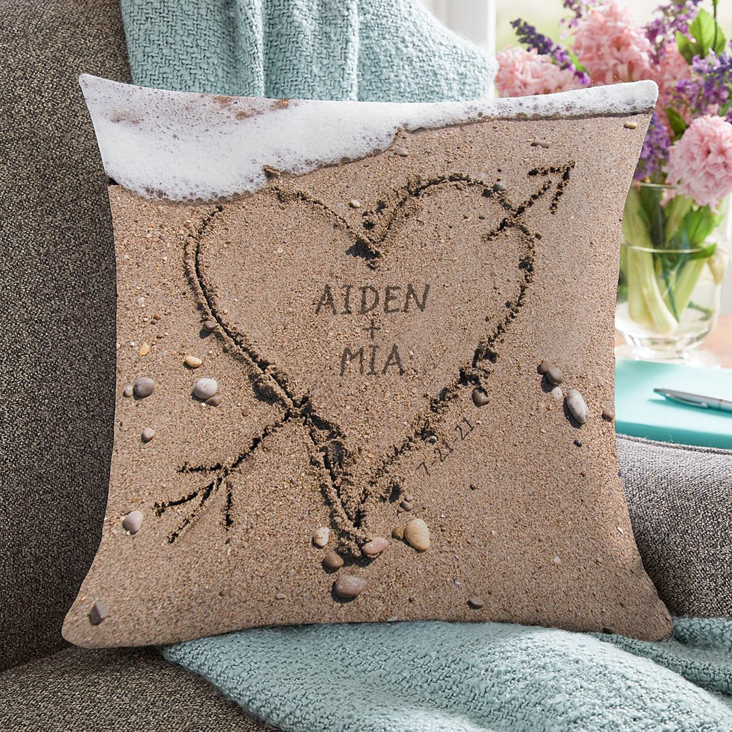 Remember romantic walks on the beach and warm ocean breezes whenever you look at this pillow. And know—even though your sand drawing is gone—the love remains. 100% cotton canvas with polyester fiberfill and zipper back Full bleed print Measures 16" sq. Personalize with any 2 names up to 9 characters each and a 2 digit month, date and year "+" will always appear Machine washable